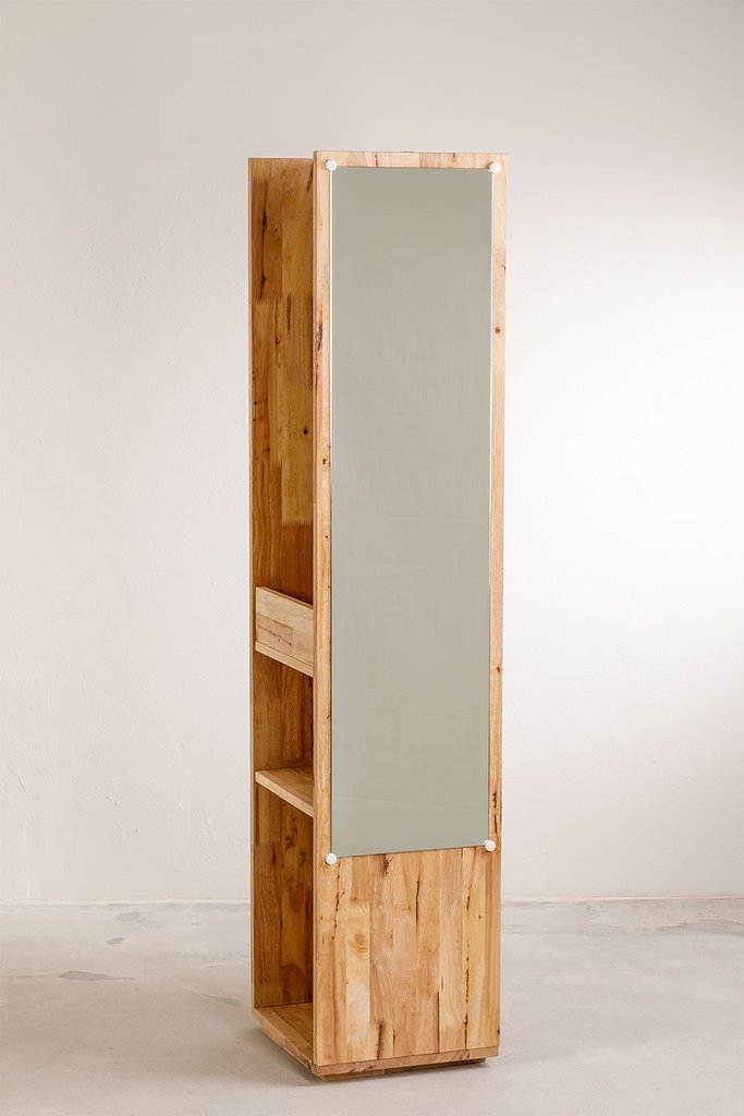 Estantería Giratoria con Espejo Arlanes una bonita composición que cuenta con un espejo, un estante y nueve colgadores, todo sobre una base giratoria en madera natural. No solo es ideal como mueble de baño, también para dormitorios o vestidores. De estilo nórdico, fabricado en madera reciclada con el que obtendrás además de un complemento funcional como es su espejo, un estante que te dará un extra en almacenamiento y unos colgadores ideales para colocar tus accesorios de forma ordenada.